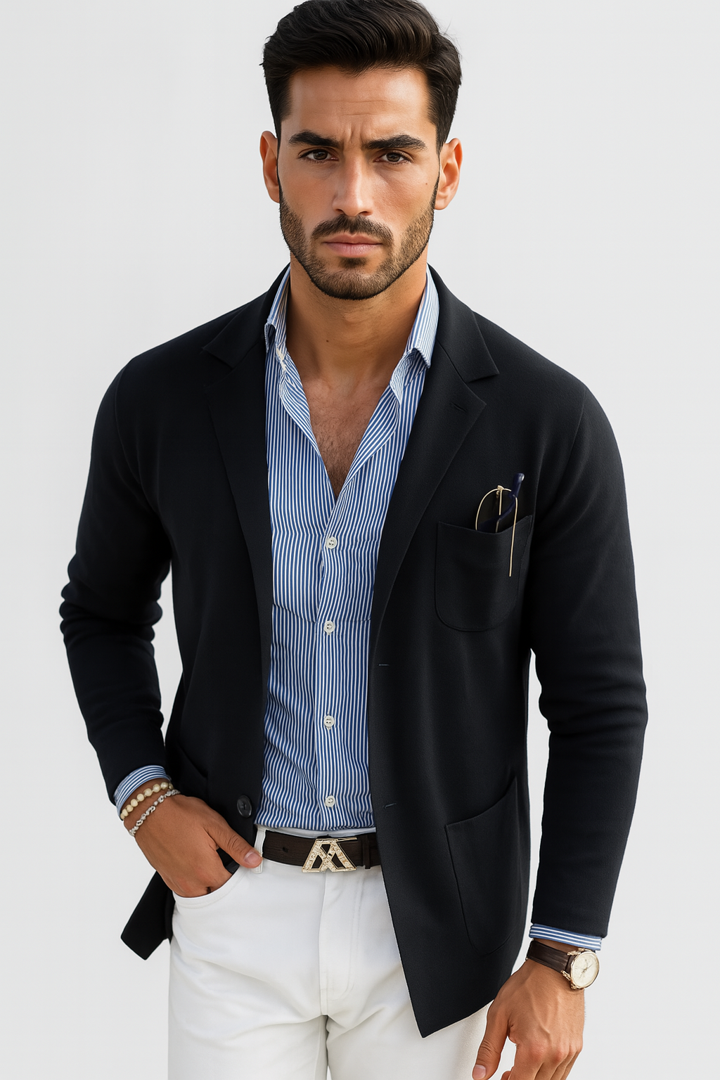 Introducing the Brayden Men’s Modern Knit Blazer – the perfect fusion of refined tailoring and everyday comfort. Whether you're heading into the office, closing deals over coffee, or making an impression on a night out, Brayden makes it effortless to look put together without the stiffness of traditional blazers.