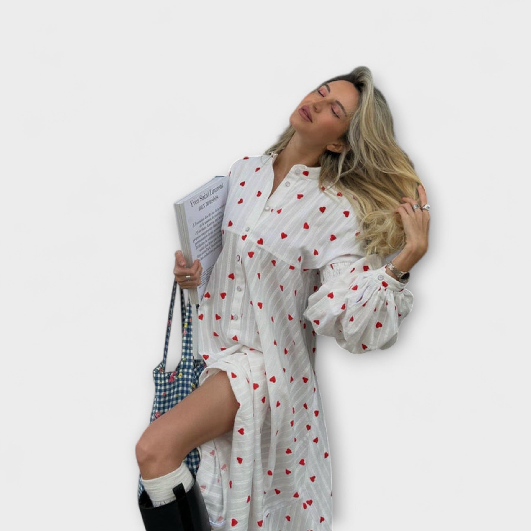 Elna is like a day in the countryside, full of sunshine, lightness, and romantic charm. The fine jacquard cotton with red heart motifs gives the dress a playful elegance, while the voluminous balloon sleeves and the wide swinging skirt create a feminine silhouette. Front buttons and a soft cotton lining make Elna a stylish companion for every day with feeling.