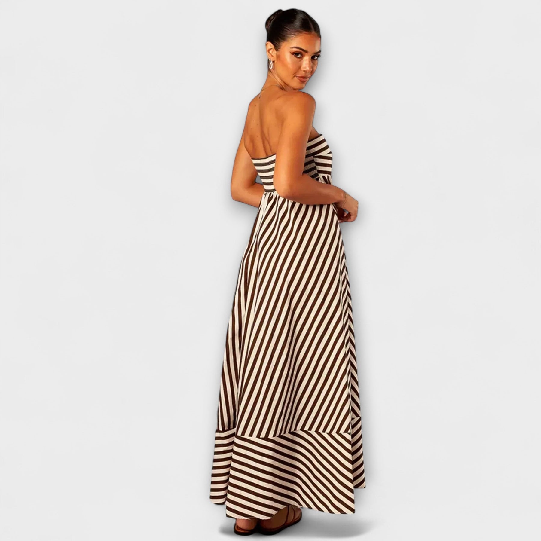 Marea is lightness in its most beautiful form – with flowing width that moves with you with every step. The strapless design and sophisticated striped pattern create a modern, summery silhouette, while the asymmetrical hem adds a subtle swing. This dress is made for sunny hours, city strolls, and stylish evening moments by the sea.