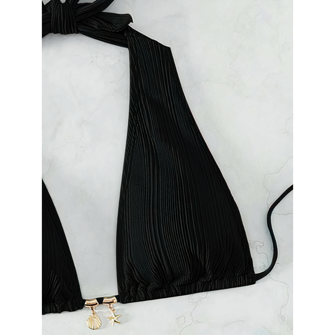 This set is designed to give you a striking and sophisticated look with its halter neck design and adjustable ties at the neck and back, ensuring a perfect fit and maximum comfort.