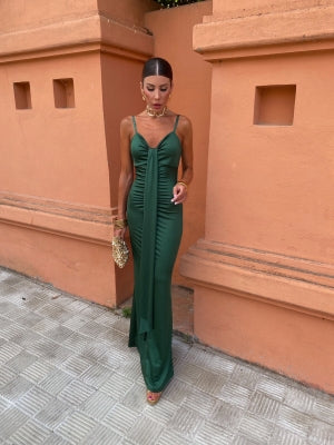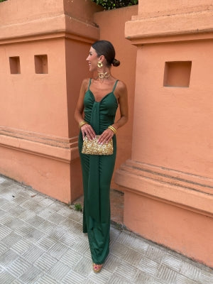 The Penelope dress exudes sophistication thanks to the satin-like fabric that drapes smoothly along the body. The deep V-neckline is enhanced by a striking knot detail that runs down from the center, creating an elongating and slimming effect.