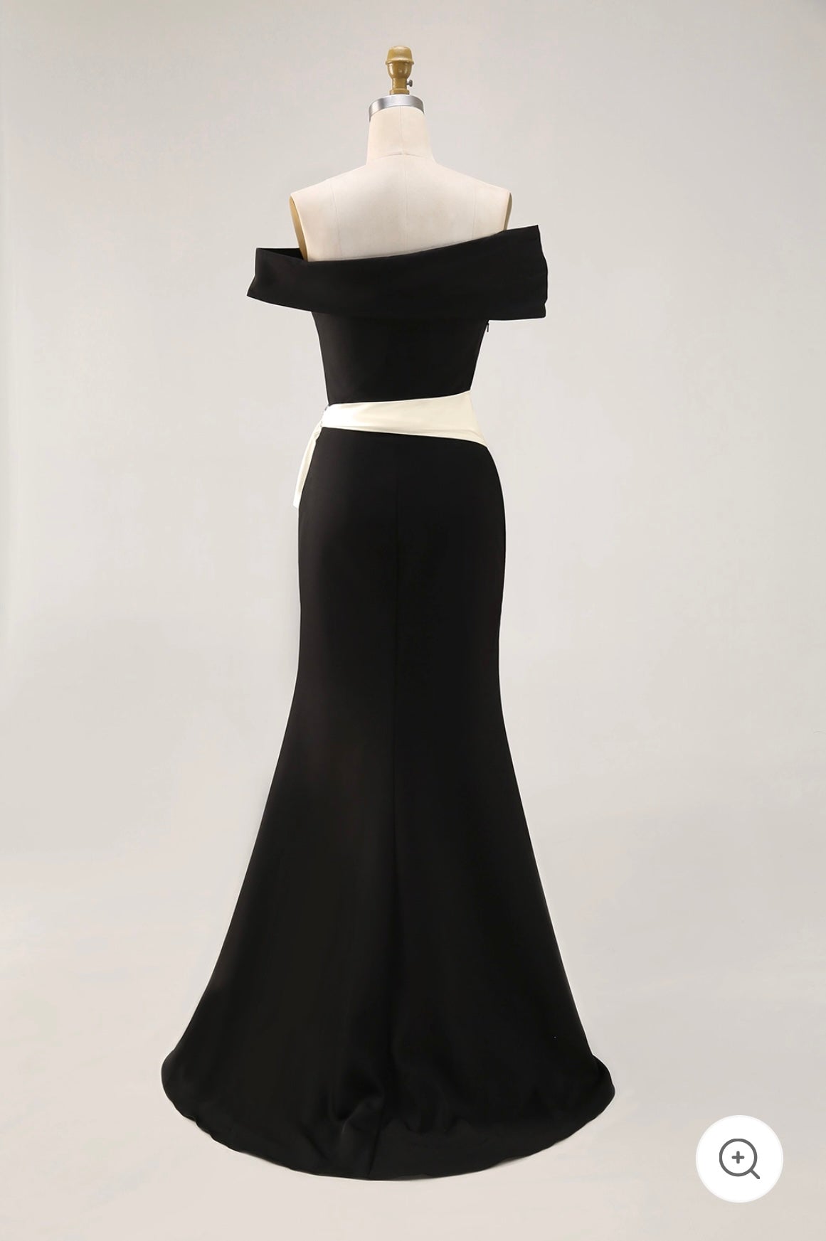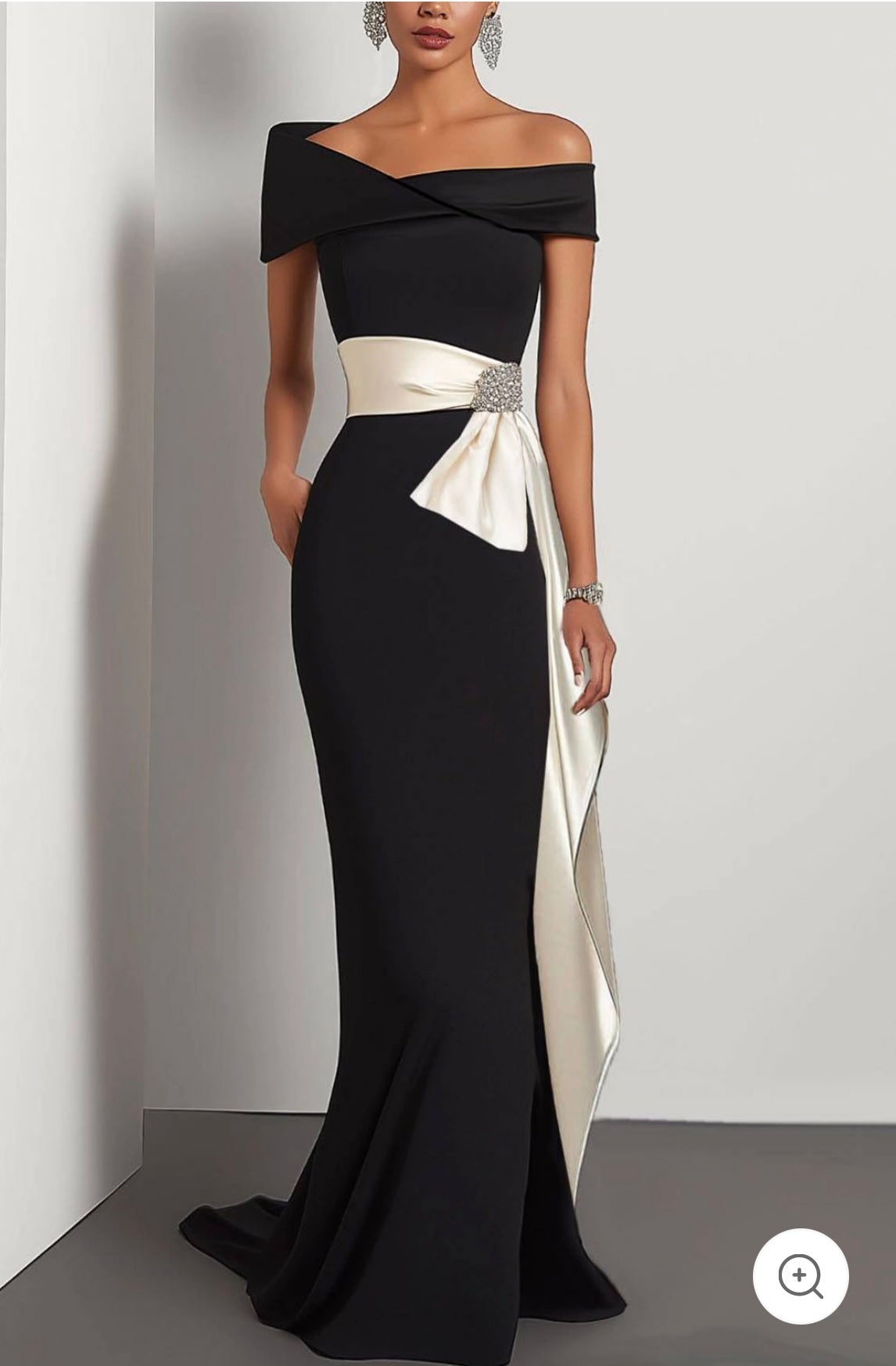 The Solenne Evening Dress is pure class. This off-shoulder dress with contrasting satin details and a flattering fit is designed to exude elegance and power. Ideal for galas, formal parties, or special evenings.