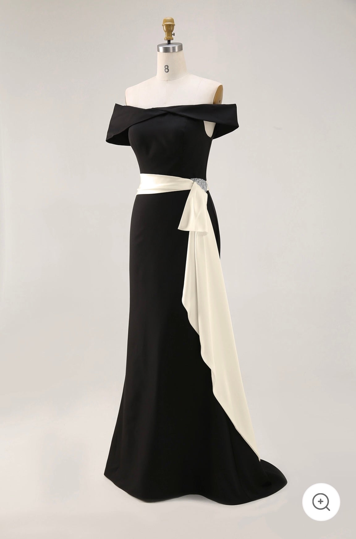 Solenne – Off-Shoulder Black Evening Gown with Champagne Sash